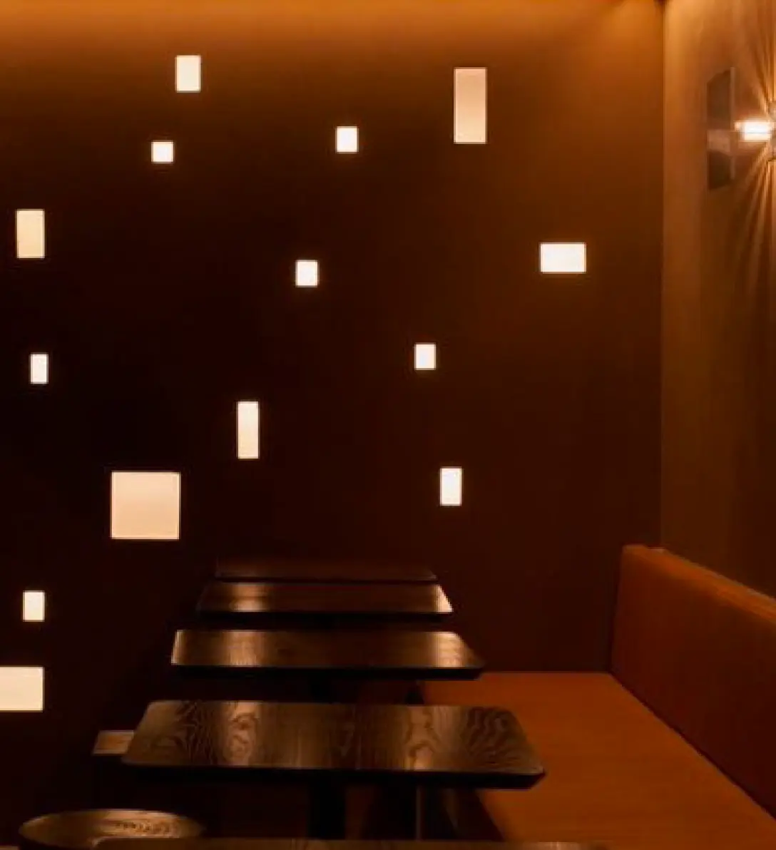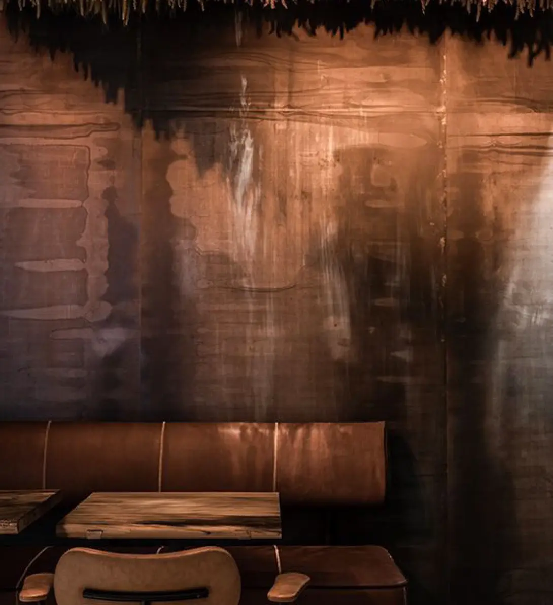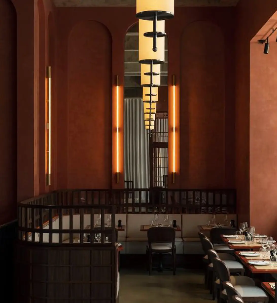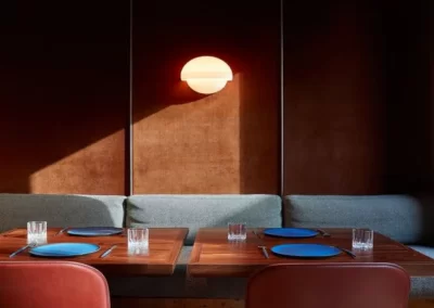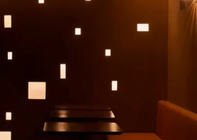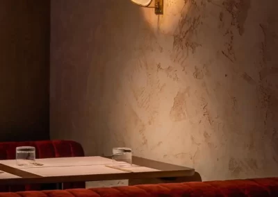 Using dim, warm lighting with soft fixtures and considering hanging clay lanterns of using terracotta lamps to cast soft, patterned light, adding to the ambiance. Dim lighting can also be achieved in a cost-effective yet intriguing way, adding an element of playfulness with shadows while giving a modern twist to the concept – we are thinking of casting fun shadows with fun cut out lighting within the feature walls of the restaurant.