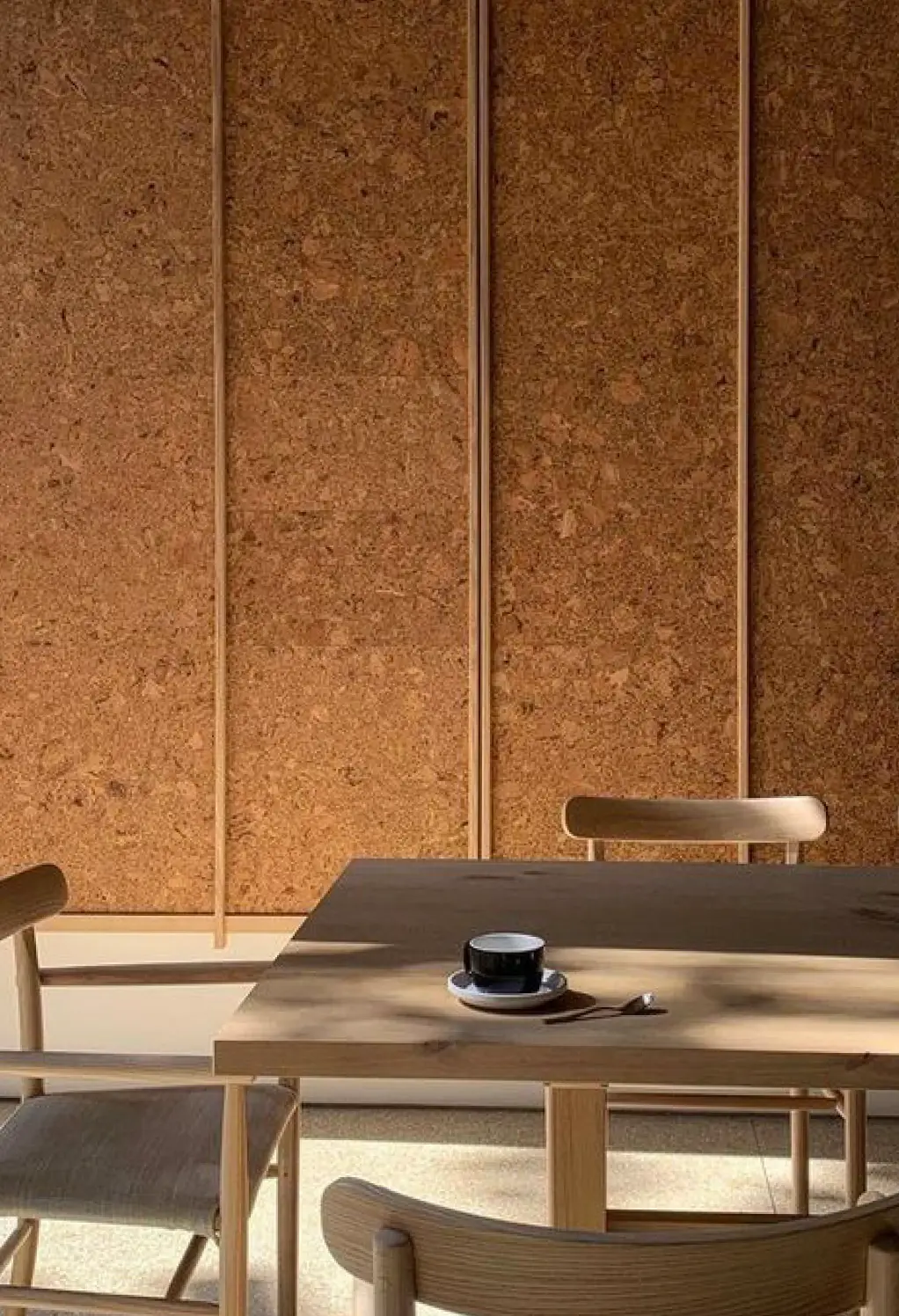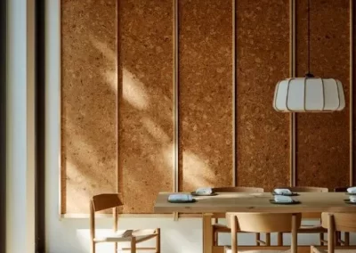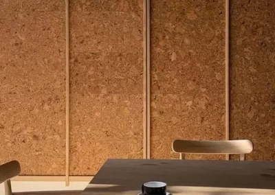 Cork functions as an acoustic solution due to it’s natural sound-absorbing properties. It dampens sound, reducing echoes and noise. In addition to it’s acoustic benefits, cork can enhance aesthetics when used in wall panels, offering a visually appealing and sustainable design solution when trimmed with high-end finishes. The natural texture and warmth of cork create a visually pleasing and functional element in interior spaces, making it an attractive choice for both acoustic performance and aesthetics in wall panel applications.