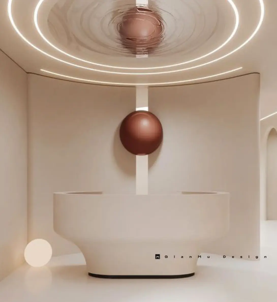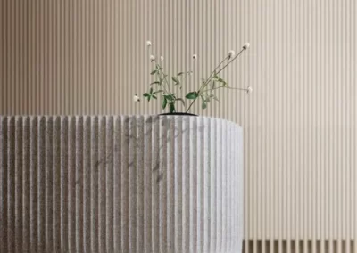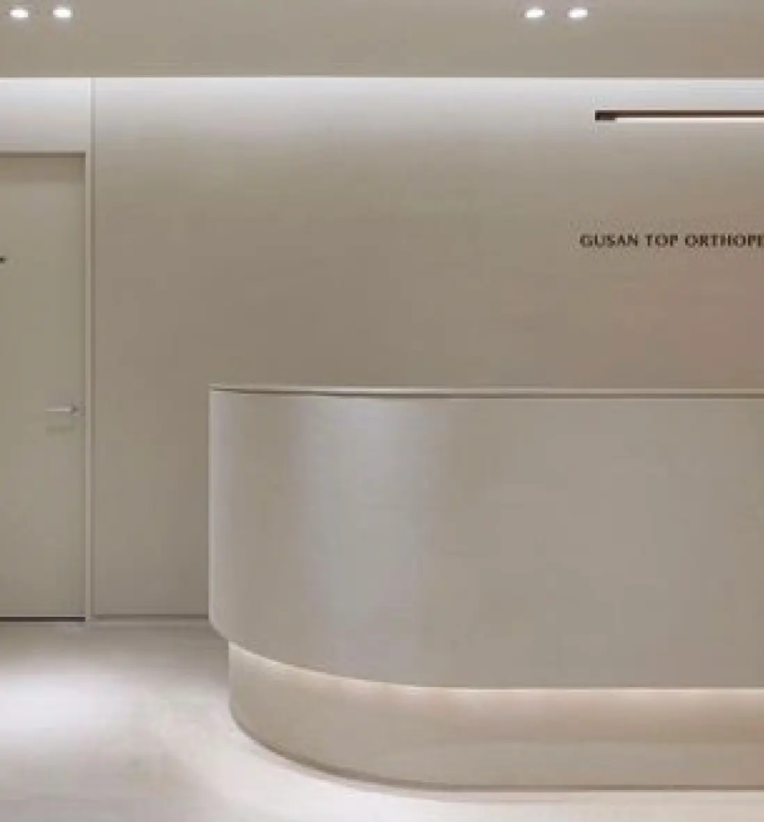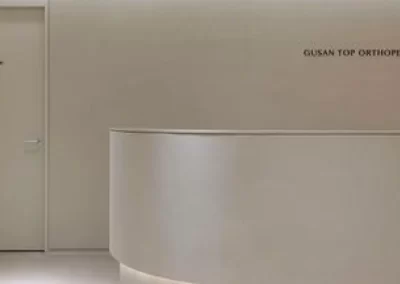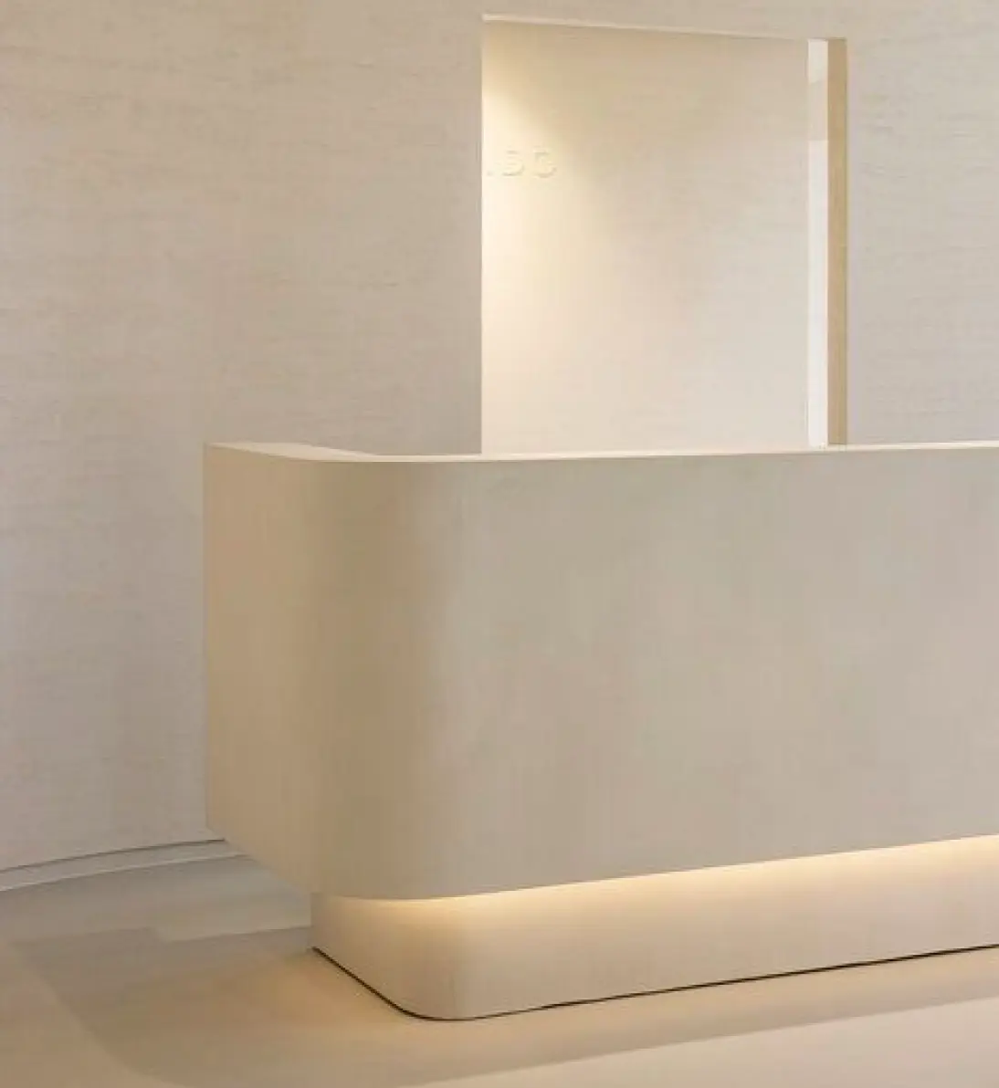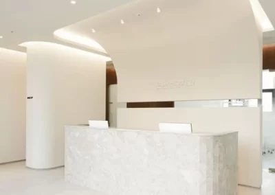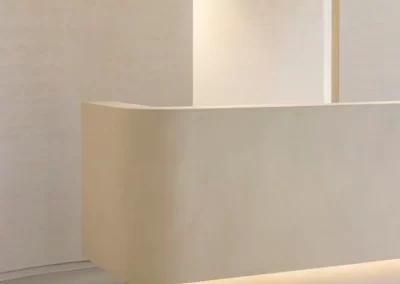 Crafted with a seamless design, the reception desk effortlessly merges with the walls and floor, creating a fluid and cohesive aesthetic that imparts a sense of continuity and unity throughout the space.