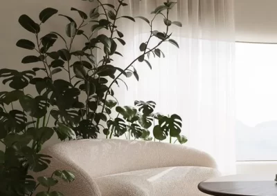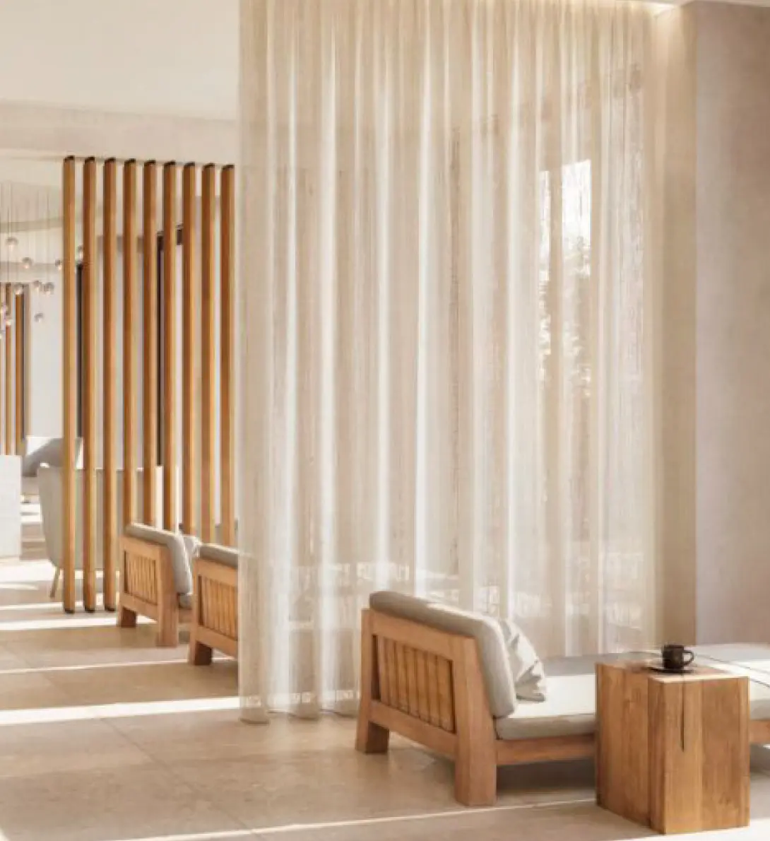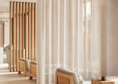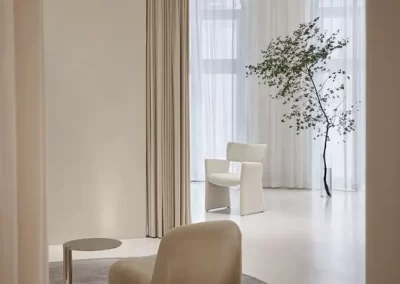 Crafting a waiting area of serene tranquillity, the design incorporates natural elements, mirrors to enhance light, and soft curtains, enveloping the space in an effortless softness. The result is a comforting, relaxing environment with warm and neutral tones, providing a space for a peaceful and enjoyable stay.
